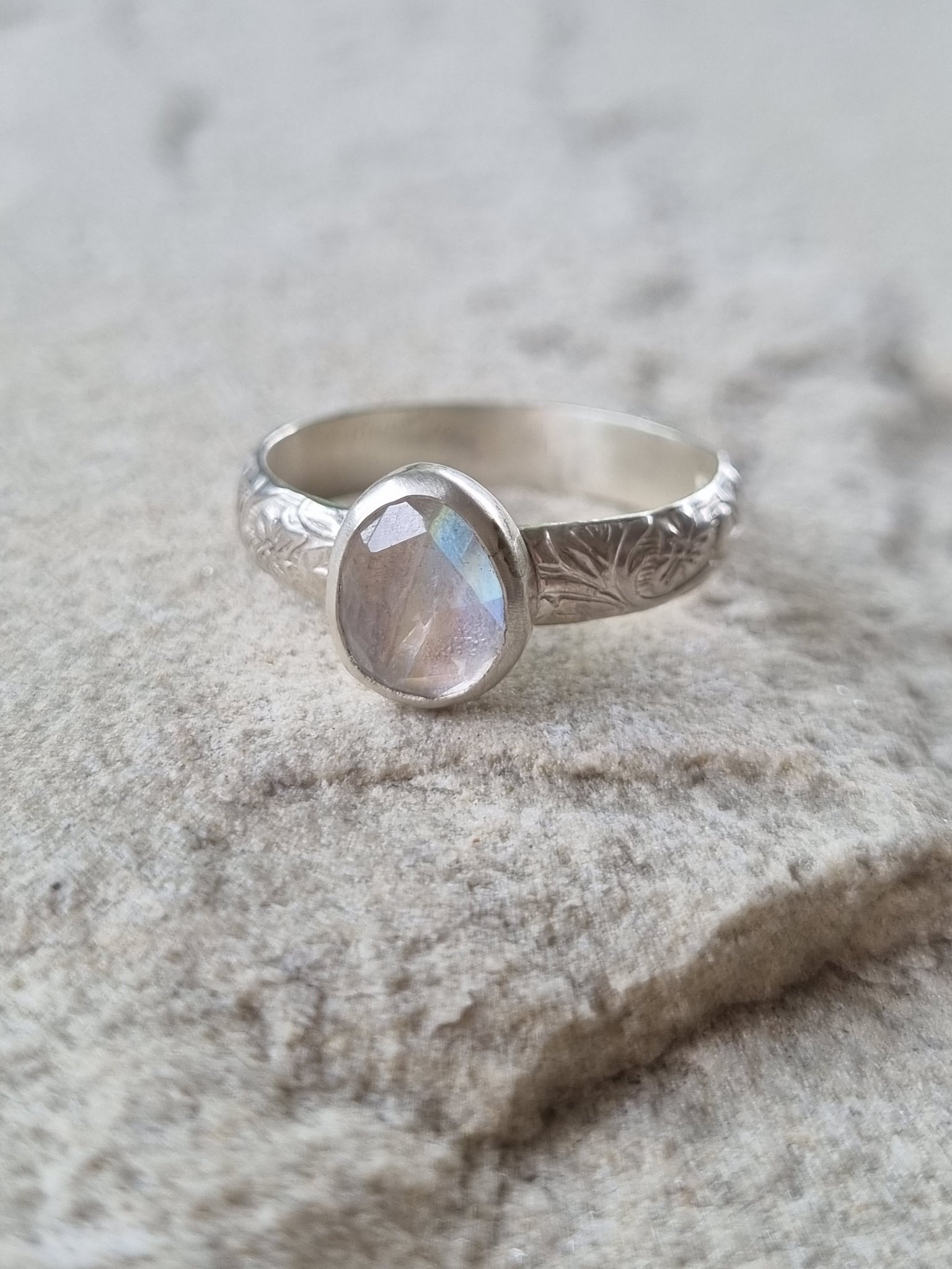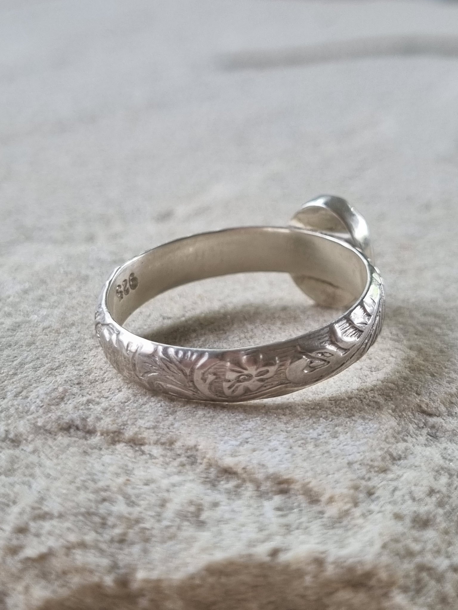 This ring features a beautiful Rosecut Moonstonbezel set with a solid patterned band