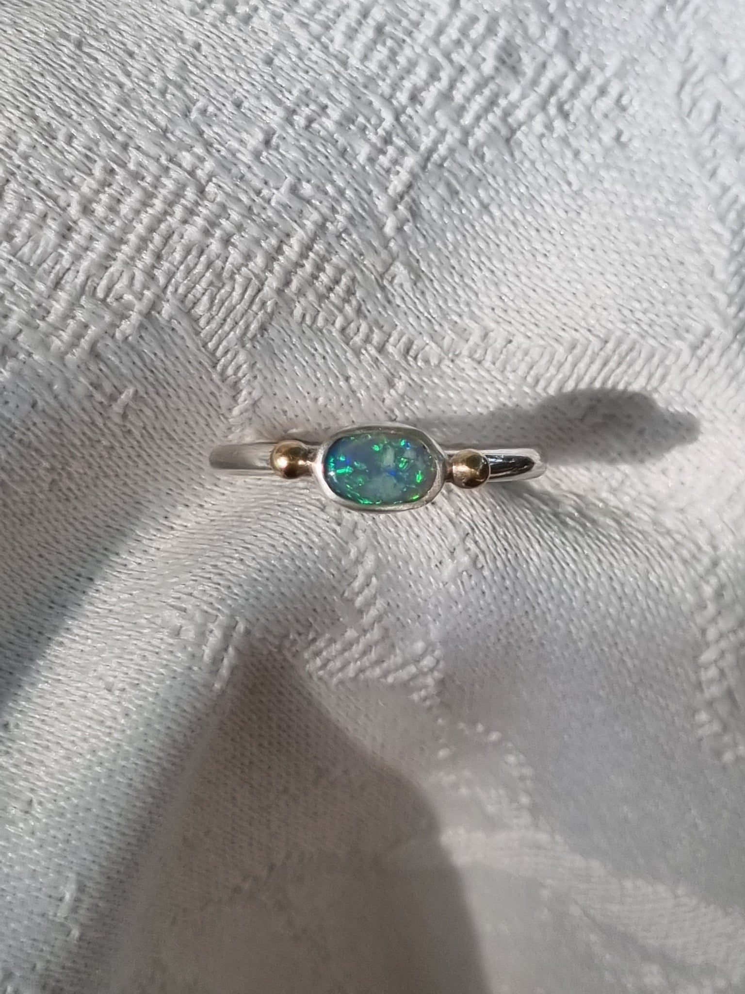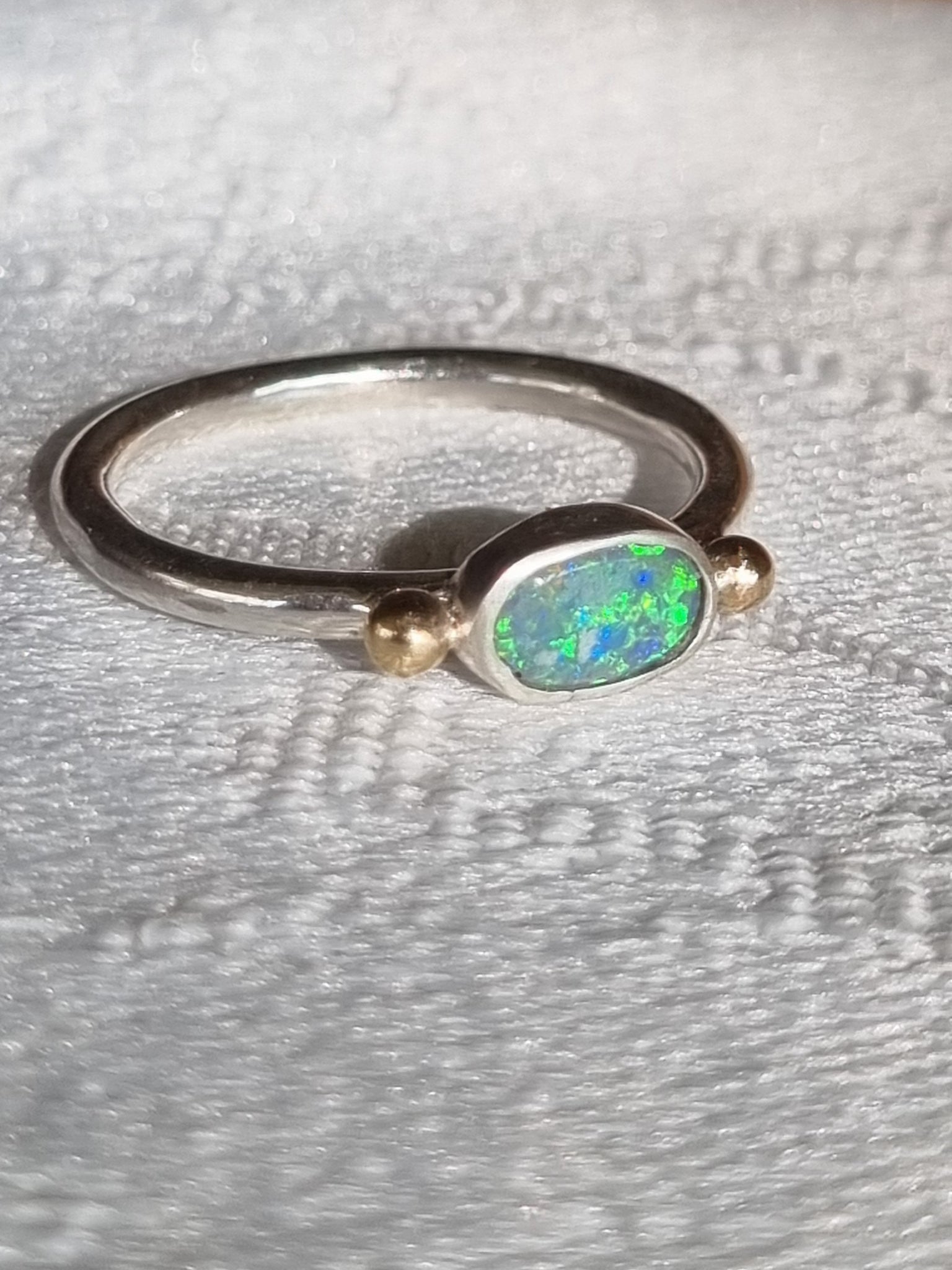 This opal has a gorgeous flash of greens and blues, handcut in Melbourne, and the ring is handcrafted with much love and intention from my home studio in Far North Queensland