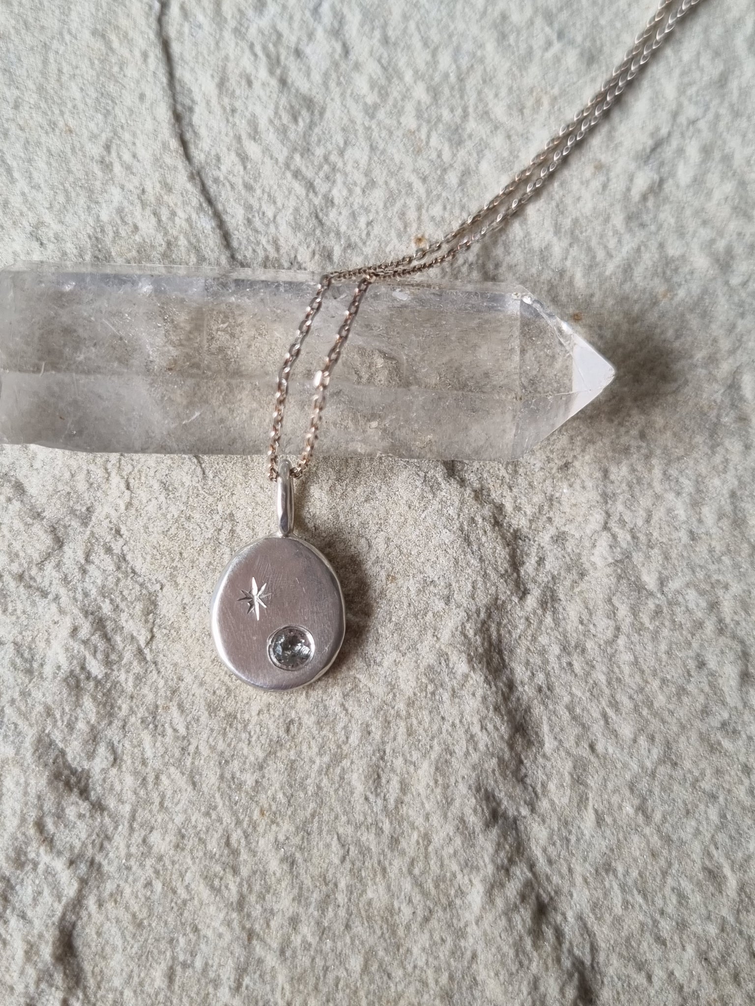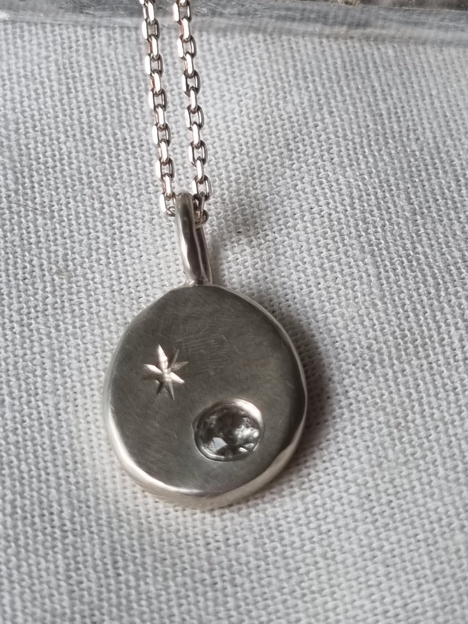 This pendant features a brilliant cut Aquamarine, flush set into recycled silver, and hand engraved star.