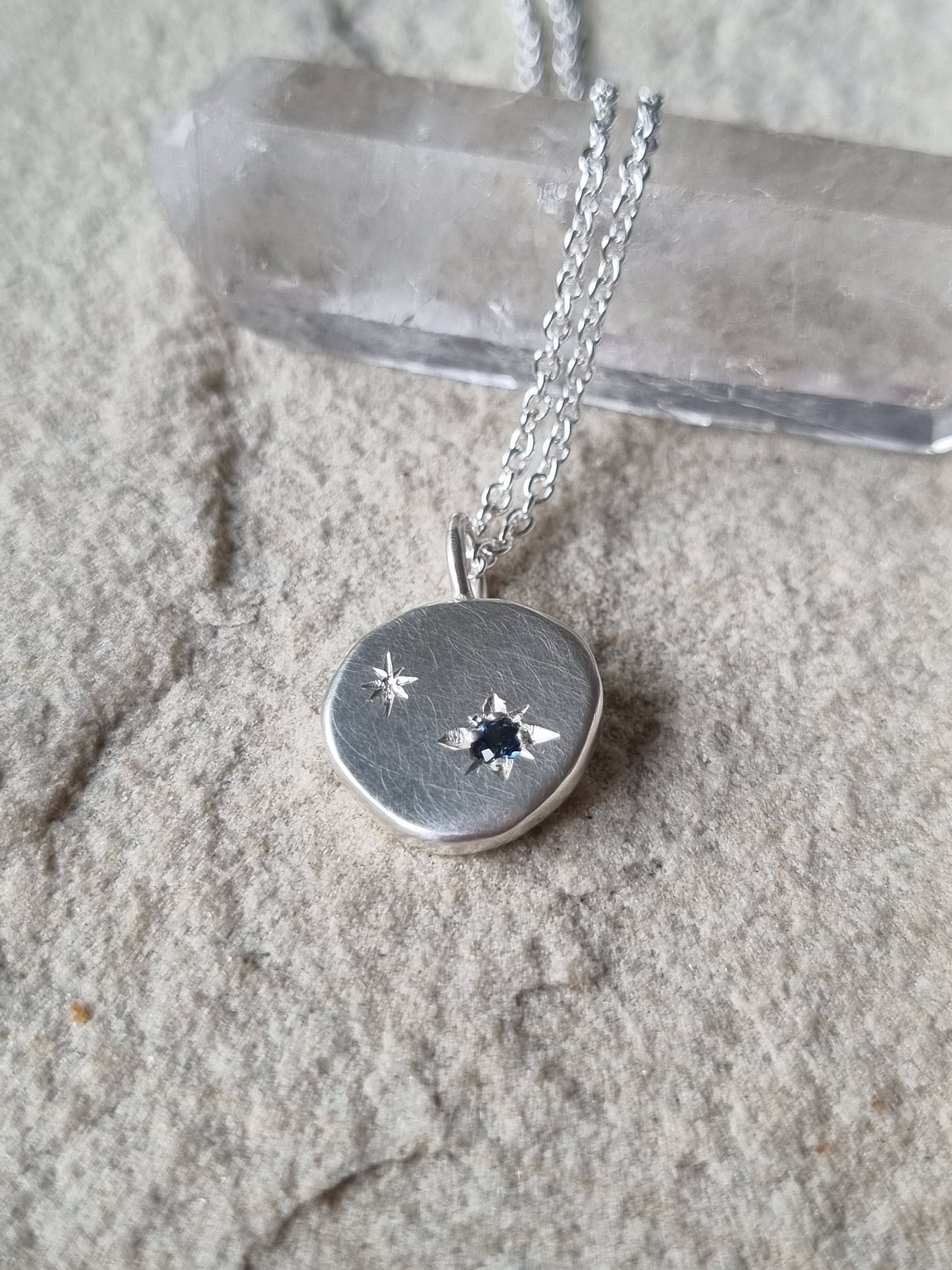 This pendant features a brilliant cut Australian teal Sapphire, bead set into recycled silver, and hand engraved star.