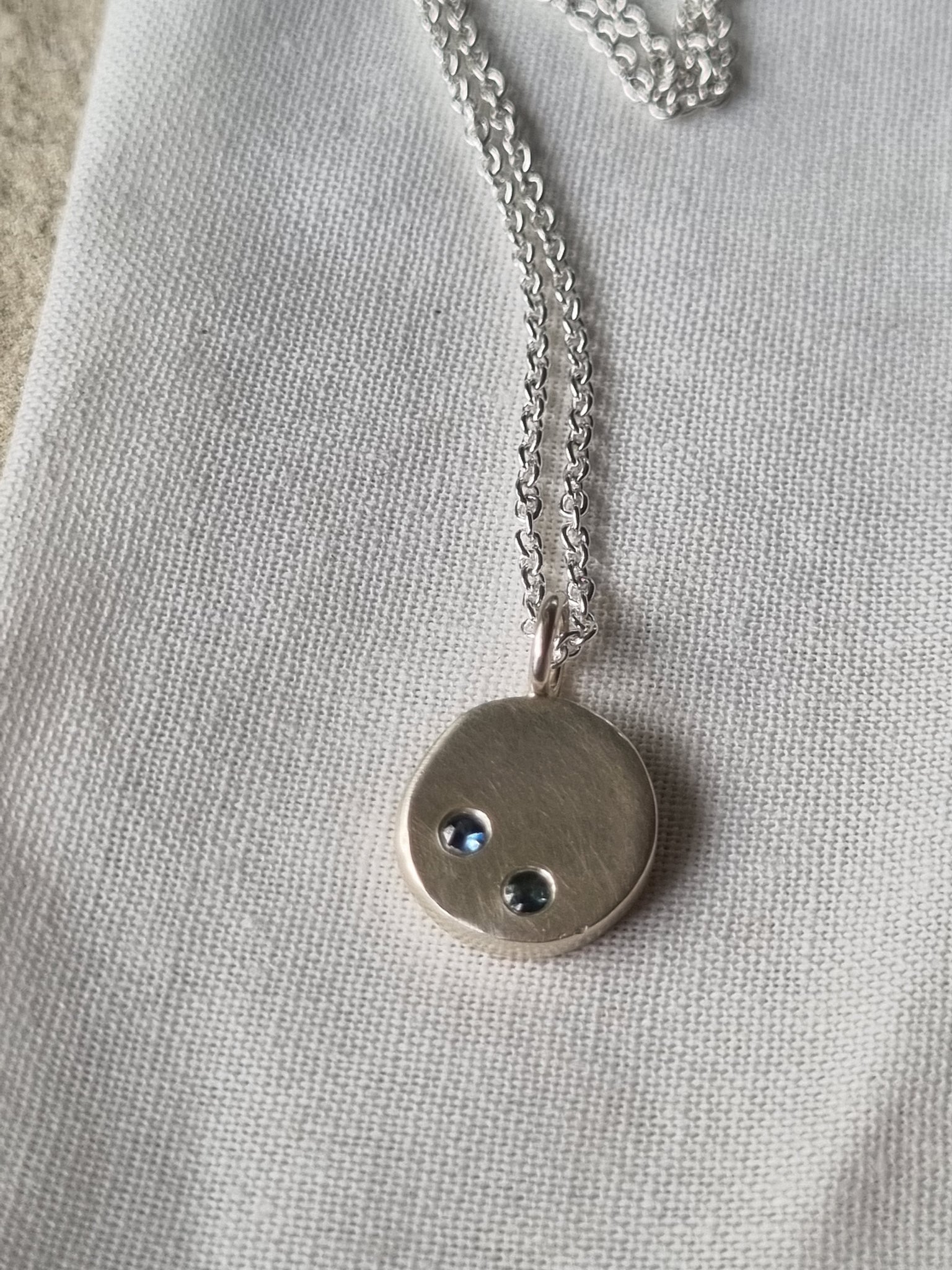 This pendant features two brilliant cut Australian teal Sapphires, flush set into recycled silver